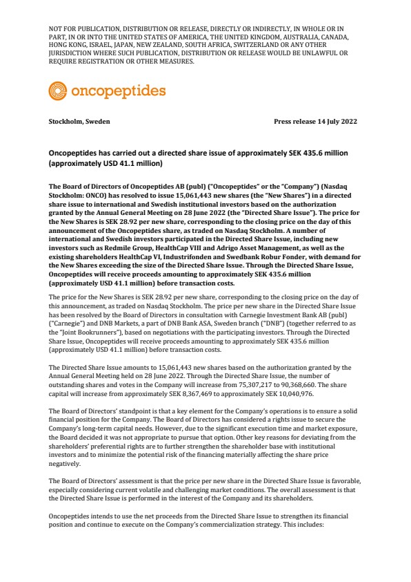 The Board of Directors of Oncopeptides AB (publ) (“Oncopeptides” or the “Company”) (Nasdaq Stockholm: ONCO) has resolved to issue 15,061,443 new shares (the “New Shares”) in a directed share issue to international and Swedish institutional investors based on the authorization granted by the Annual General Meeting on 28 June 2022 (the “Directed Share Issue”). The price for the New Shares is SEK 28.92 per new share, corresponding to the closing price on the day of this announcement of the Oncopeptides share, as traded on Nasdaq Stockholm. A number of international and Swedish investors participated in the Directed Share Issue, including new investors such as Redmile Group, HealthCap VIII and Adrigo Asset Management, as well as the existing shareholders HealthCap VI, Industrifonden and Swedbank Robur Fonder, with demand for the New Shares exceeding the size of the Directed Share Issue. Through the Directed Share Issue, Oncopeptides will receive proceeds amounting to approximately SEK 435.6 million (approximately USD 41.1 million) before transaction costs.