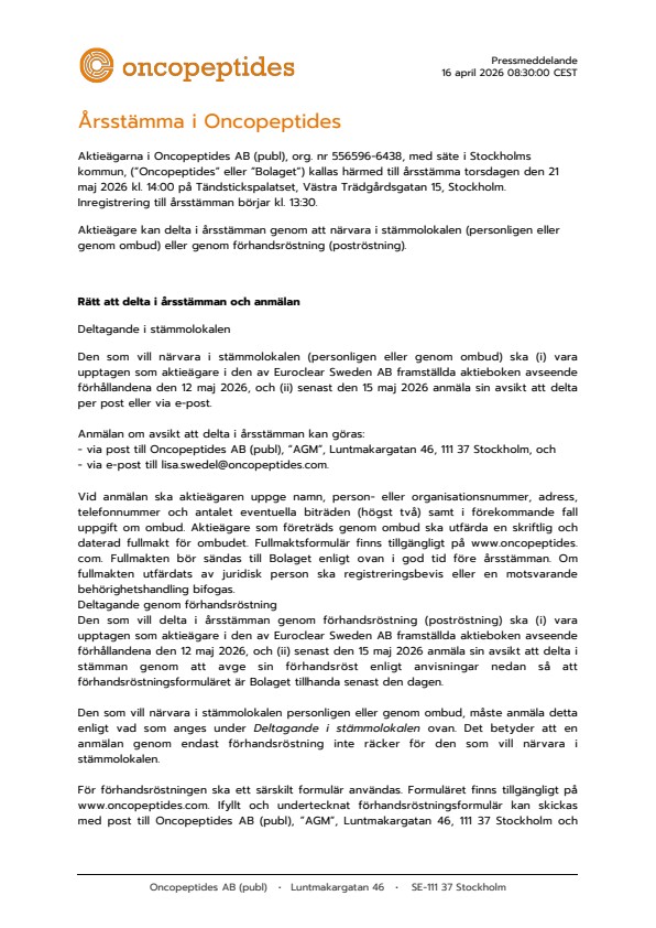 Aktieägarna i Oncopeptides AB (publ), org. nr 556596-6438, med säte i Stockholms kommun, (”Oncopeptides” eller ”Bolaget”) kallas härmed till årsstämma torsdagen den 21 maj 2026 kl. 14:00 på Tändstickspalatset, Västra Trädgårdsgatan 15, Stockholm. Inregistrering till årsstämman börjar kl. 13:30.