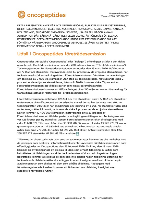 Oncopeptides AB (publ) (“Oncopeptides” eller “Bolaget”) offentliggör utfallet i den delvis garanterade företrädesemissionen om cirka 200 miljoner kronor (“Företrädesemissionen”). Teckningsperioden för Företrädesemissionen avslutades den 16 mars 2026. Utfallet visar att 77 082 970 stamaktier, motsvarande cirka 60 procent av de erbjudna stamaktierna, har tecknats med stöd av teckningsrätter i Företrädesemissionen. Därutöver har anmälningar om teckning av 3 096 716 stamaktier utan stöd av teckningsrätter, motsvarande cirka 2 procent av de erbjudna stamaktierna, inkommit. Därför kommer cirka 33 procent av Företrädesemissionen att tilldelas parter som ingått garantiåtaganden. Företrädesemissionen kommer att tillföra Bolaget cirka 190 miljoner kronor före avdrag för transaktionskostnader relaterade till Företrädesemissionen.